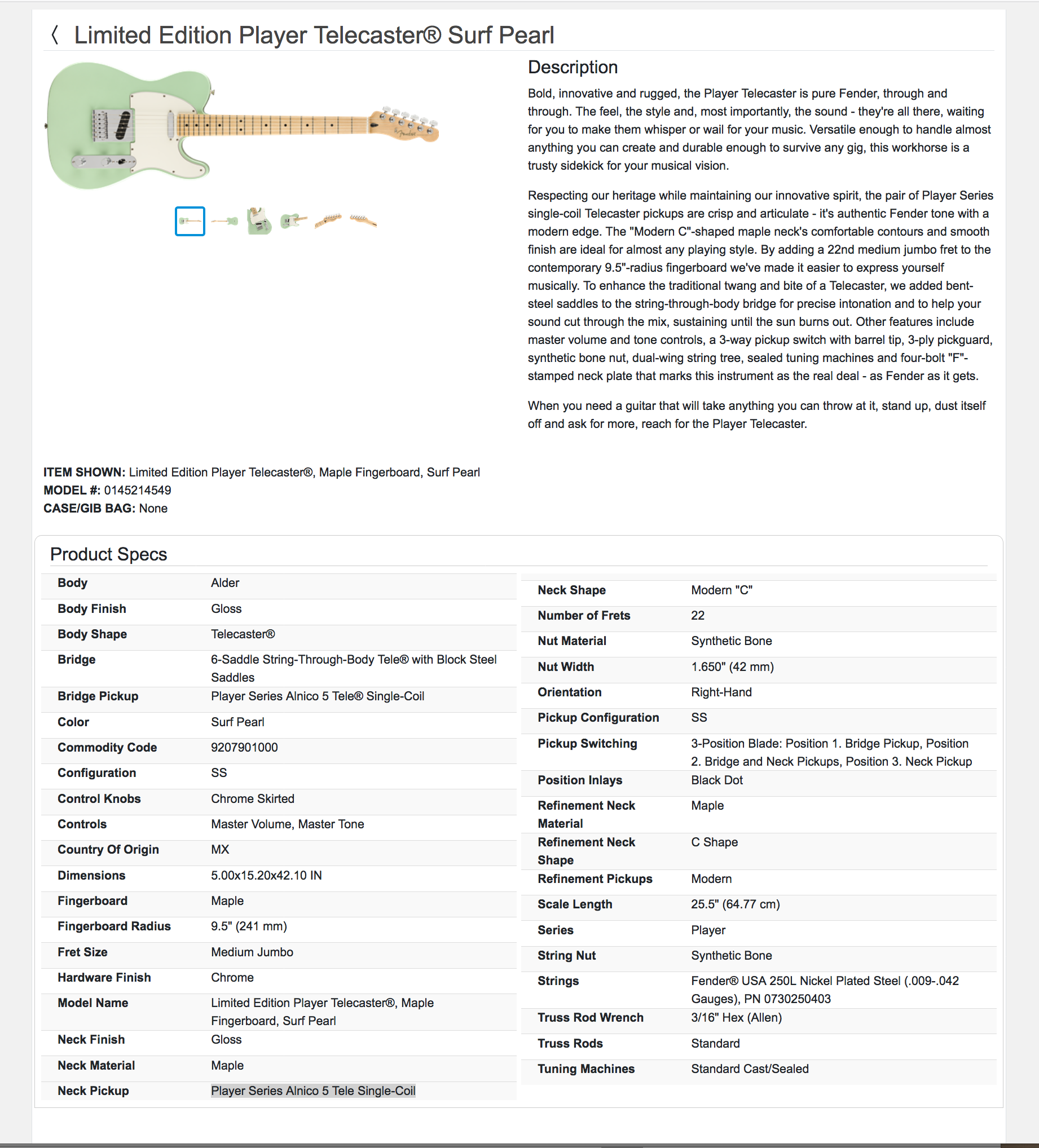 | Pickups | N: Player Alnico 5 Tele / B: USA Fender Std Tele pickup |